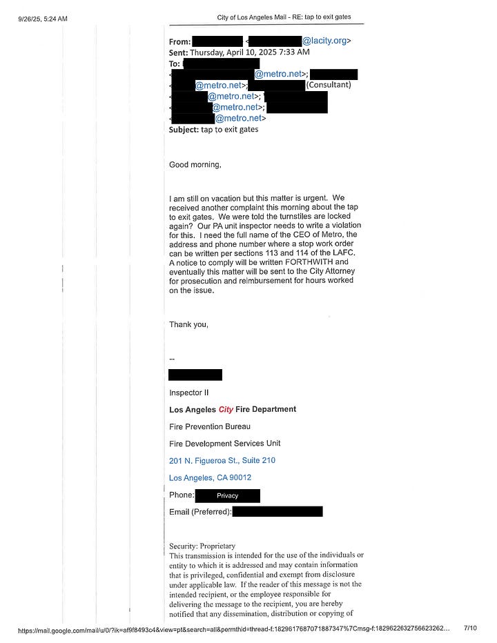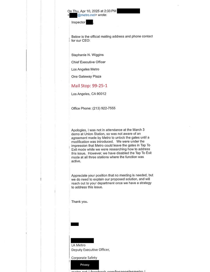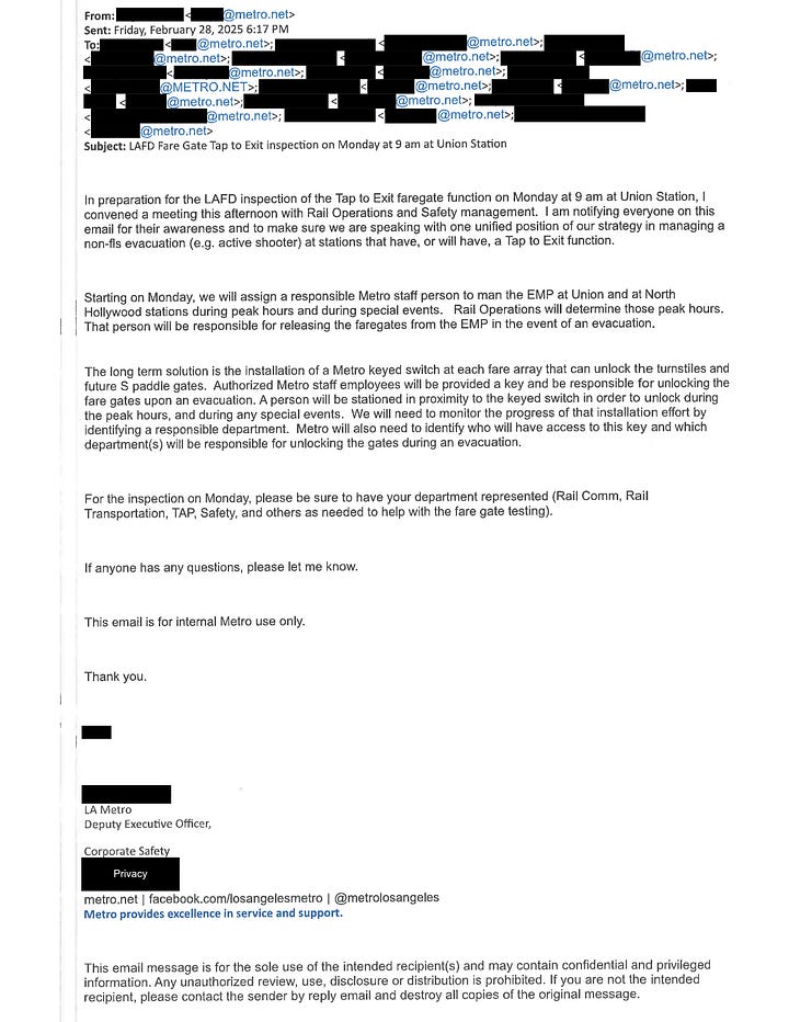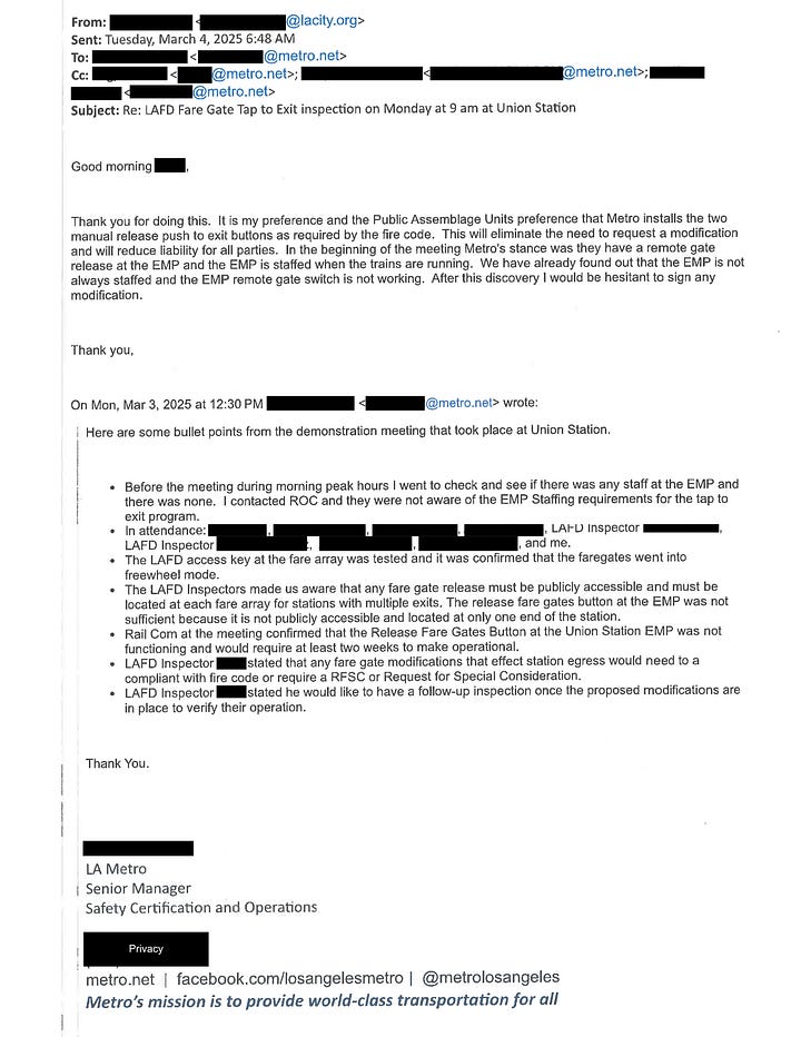 Despite being told by LAFD that the setup for Tap-to-Exit didn’t meet the fire code, Metro appears to have continued the program. About a month after the inspection, on April 10, Metro received an email from LAFD advising them to immediately cease the program or a violation would be filed.