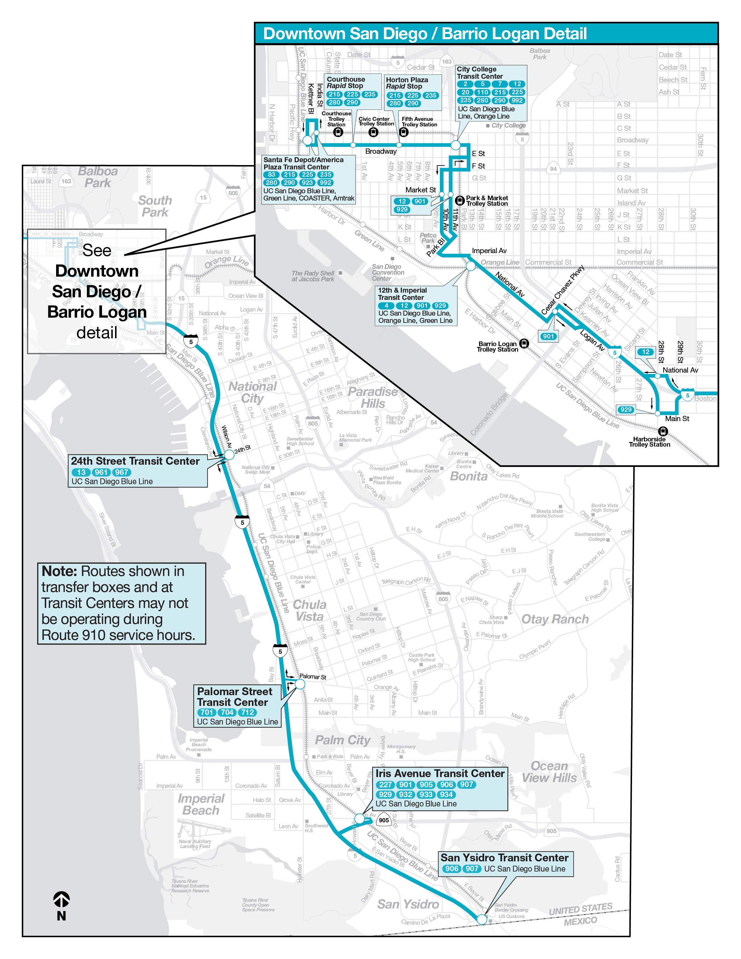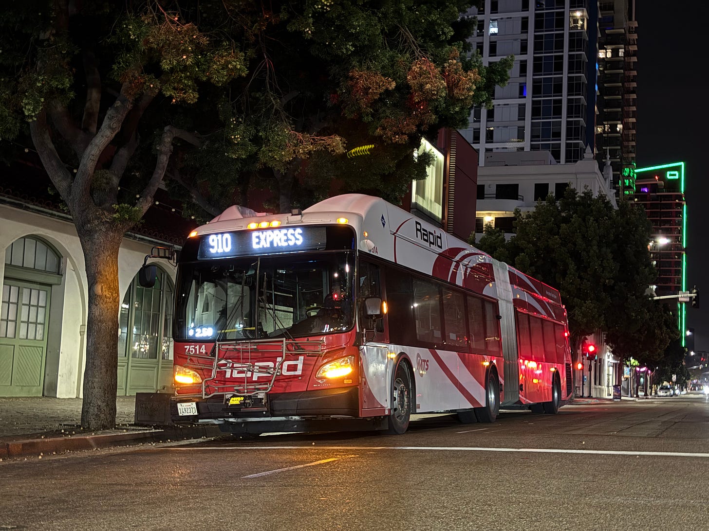 Route 910, the first overnight transit service in San Diego, will continue operating after the MTS board approved the service at a public hearing Thursday morning. Route 910 was introduced as a pilot program nearly one year ago, as a pilot express route connecting all Blue Line stations between the Santa Fe Depot and Harborside, then making limited stops at 24th Street, Palomar Street, Iris Avenue, and San Ysidro-International.