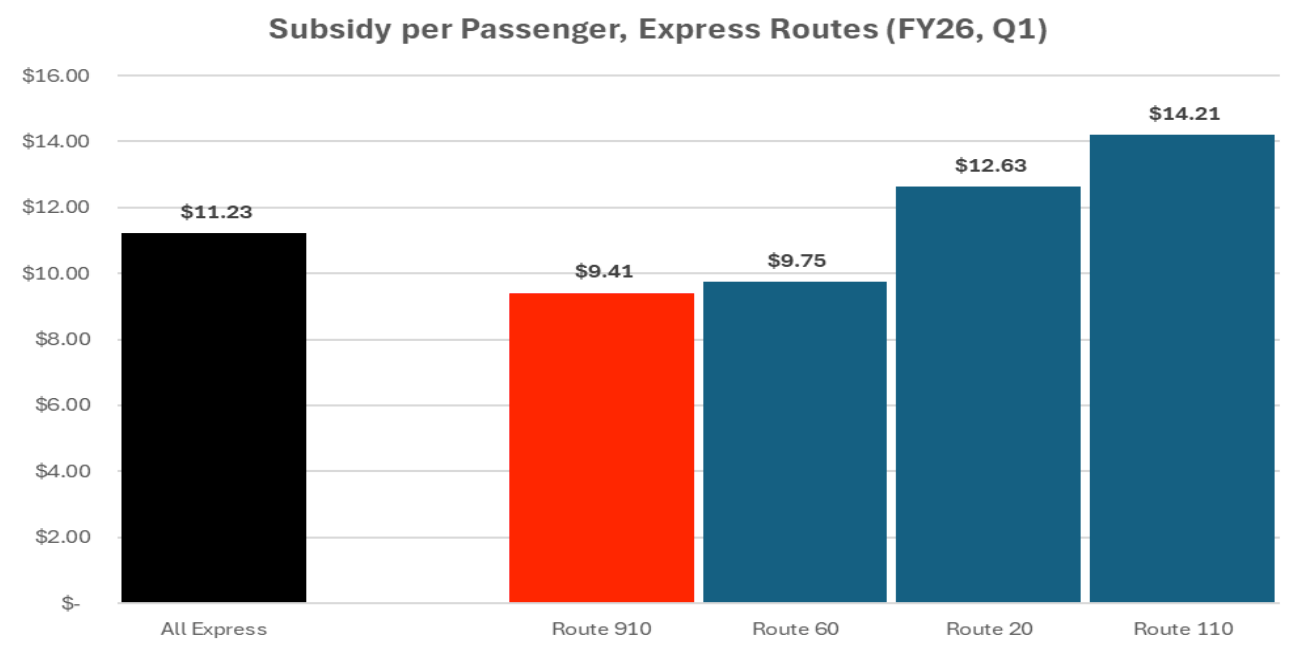 Since launch, route 910 service has shown signs of success, carrying an average of over 220 passengers per day, according to the MTS presentation. This puts the average passenger subsidy (the amount it costs MTS to provide a single ride on a service, after all operational costs are accounted for) well below comparable limited-hour express routes.